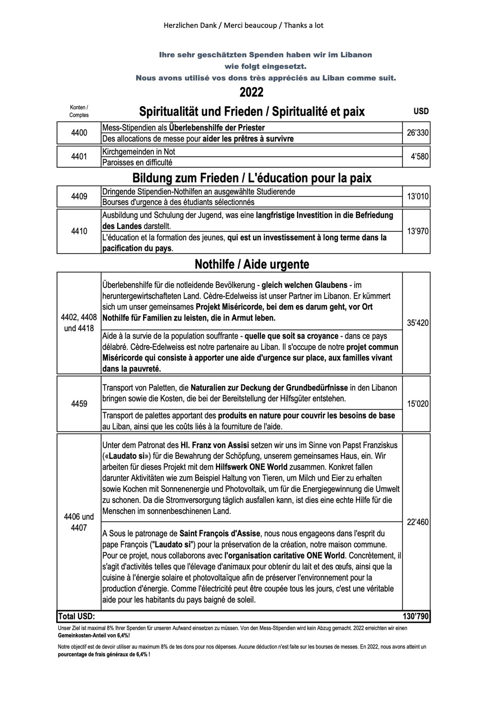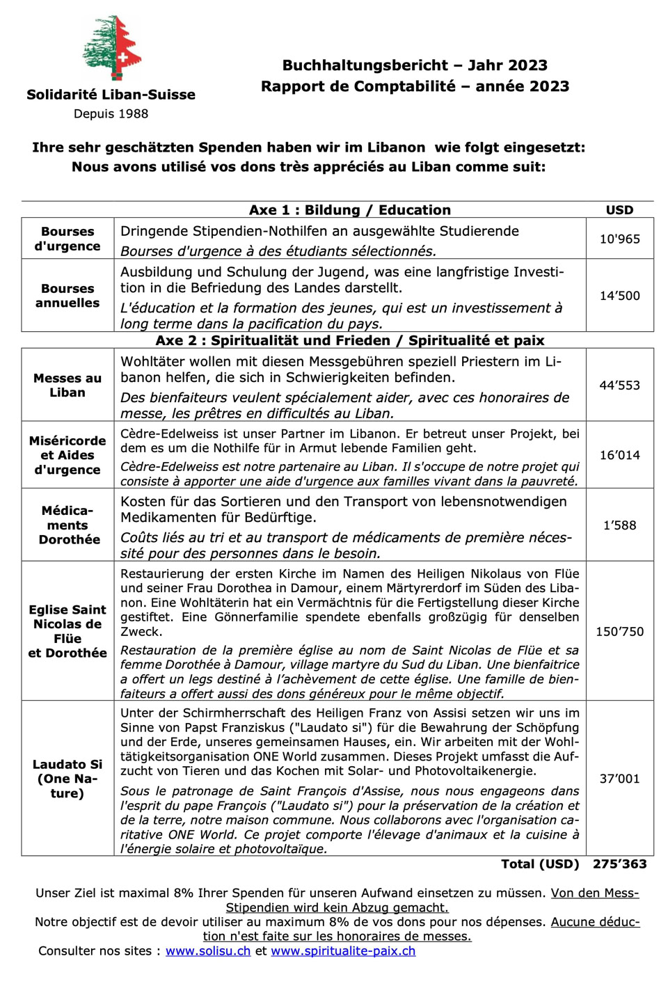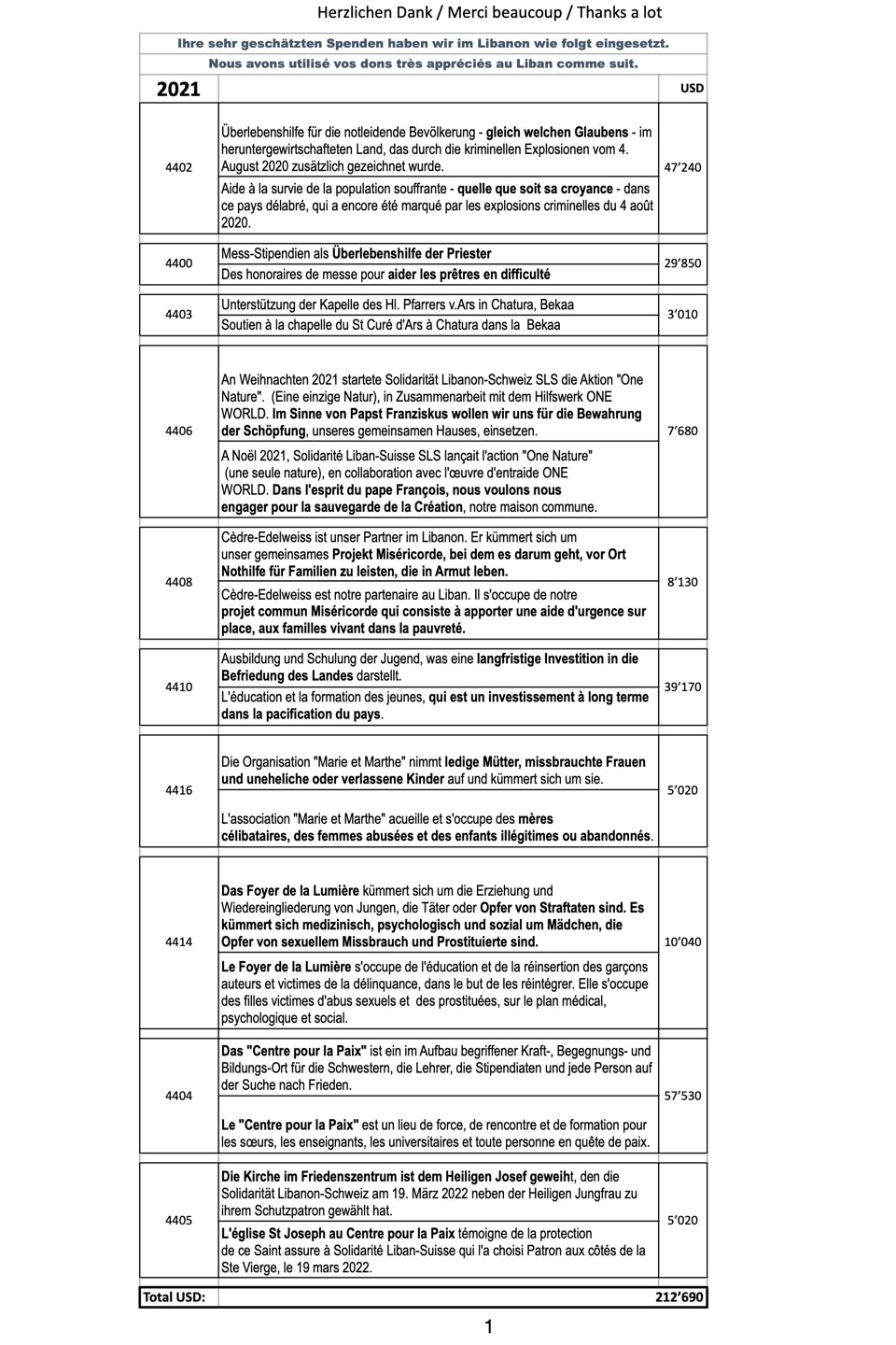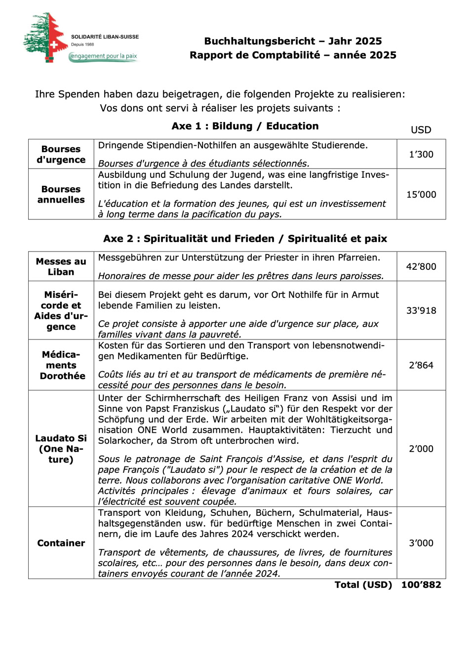 Les dons servent à financer au Liban l’éducation, Spiritualité-aide sociale et respect de la création. Depuis 2019, le Liban subit les plus graves crises de son existence, surtout une grave inflation, le chômage et la pauvreté. SLS envoie aussi des produits de premières nécessités. Comme le comité et ses collaborateurs s’engagent bénévolement, les frais administratifs sont très réduits. Une attestation d’exemption d’impôt est envoyée aux bienfaiteurs.